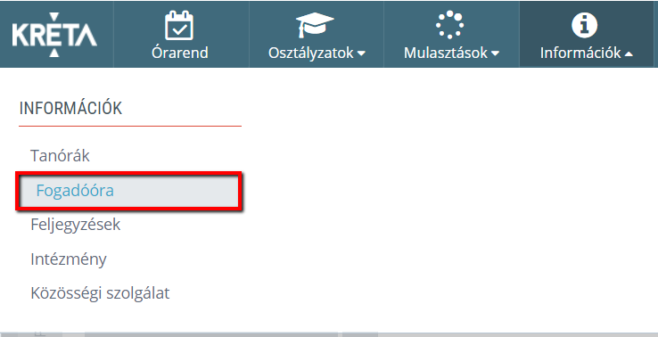 Az egyes pedagógusok által rögzített fogadóórák megtekinthetőek az e-Ellenőrző felület Információk menüpontjában található Fogadóóra menüpontban.