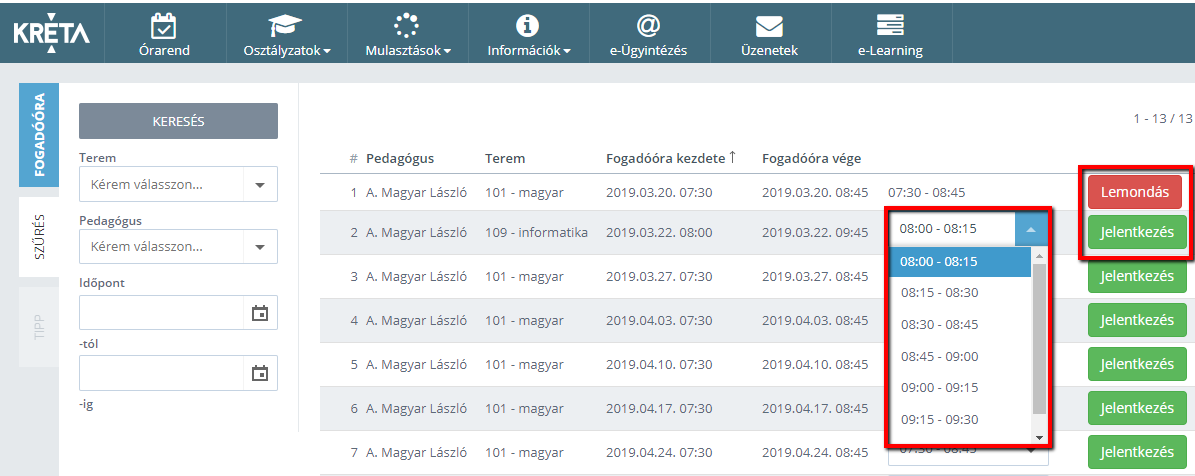 1. A listából a pedagógus nevét tartalmazó sor végén található ’JELENTKEZÉS’ gombra kattintva tudunk a megadott fogadóórára jelentkezni. Amennyiben a pedagógus az adott napon több idősávot is megjelölt fogadóórára, ebben az esetben legördülő menüből választható ki a megfelelő idősáv.